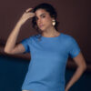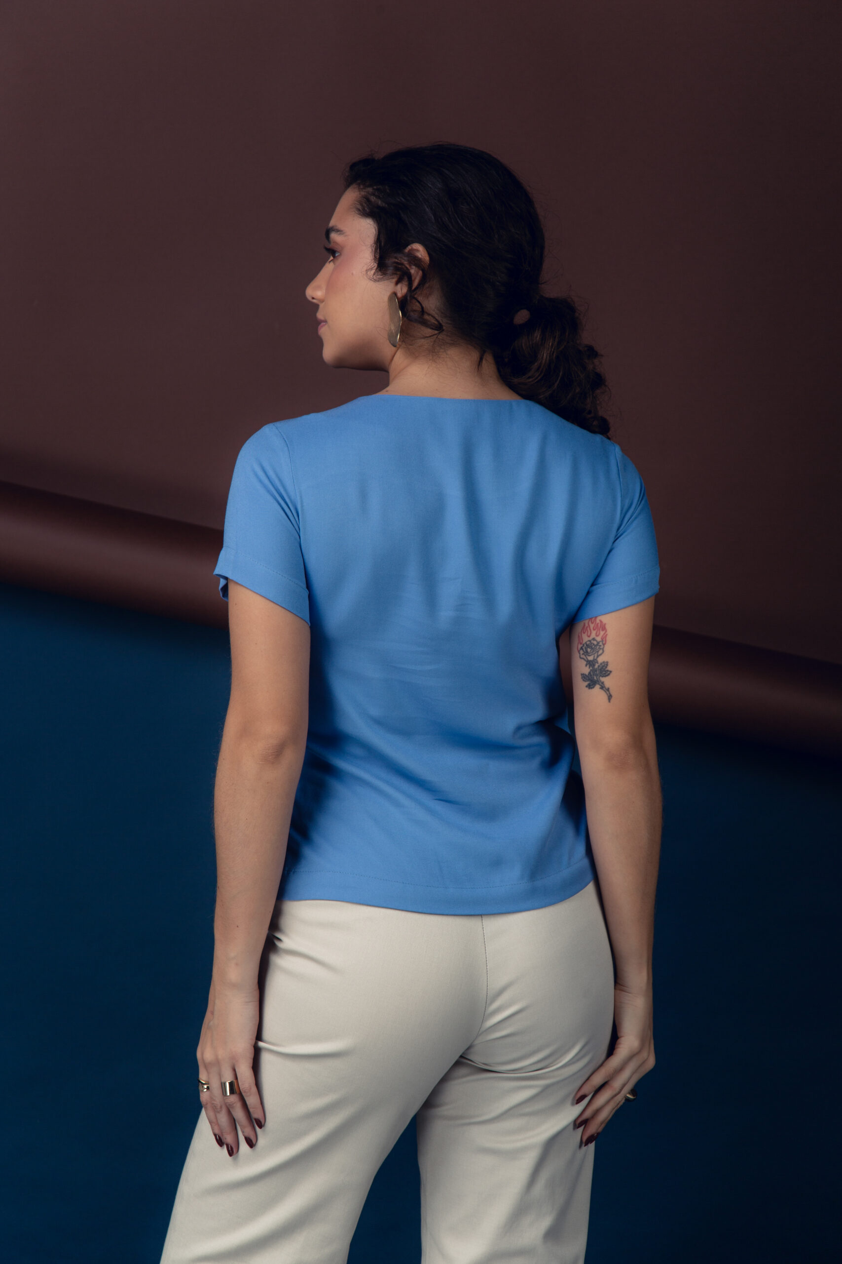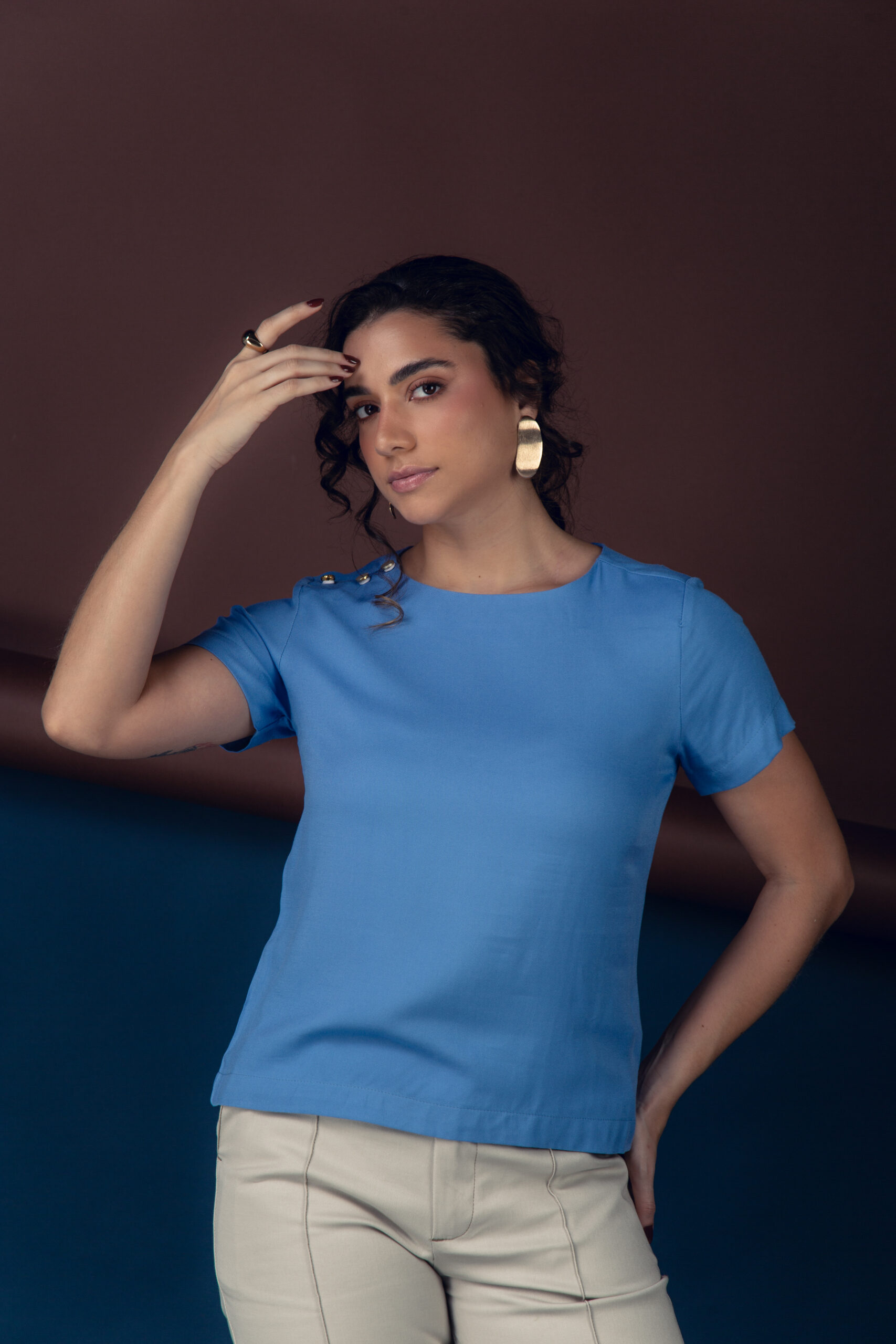 blusa básica com detalhes em botões no ombro