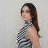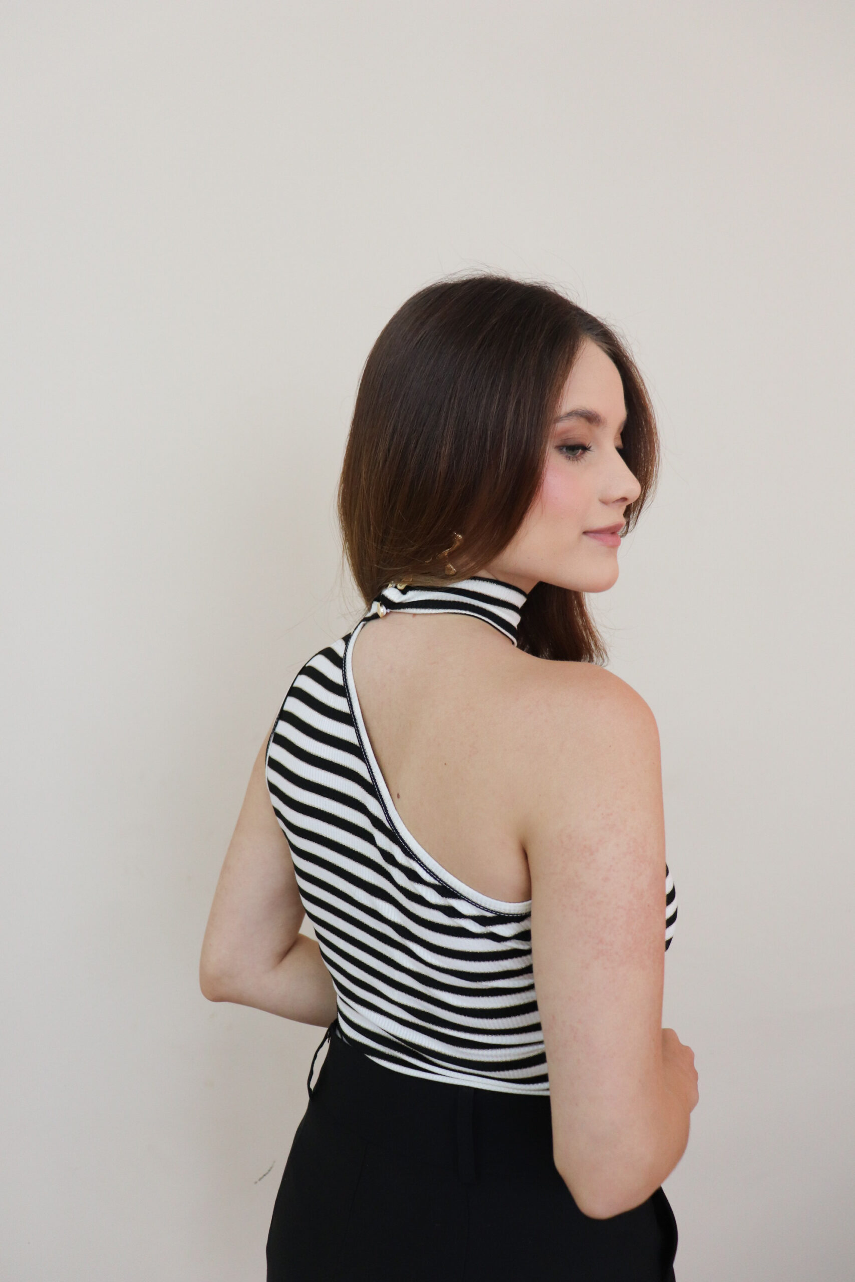 Blusa 86 % viscose + 6 % poliéster + 5 % elastano + 3 % poliamida – macia, com leve brilho e elasticidade que acompanha o movimento.