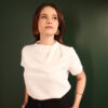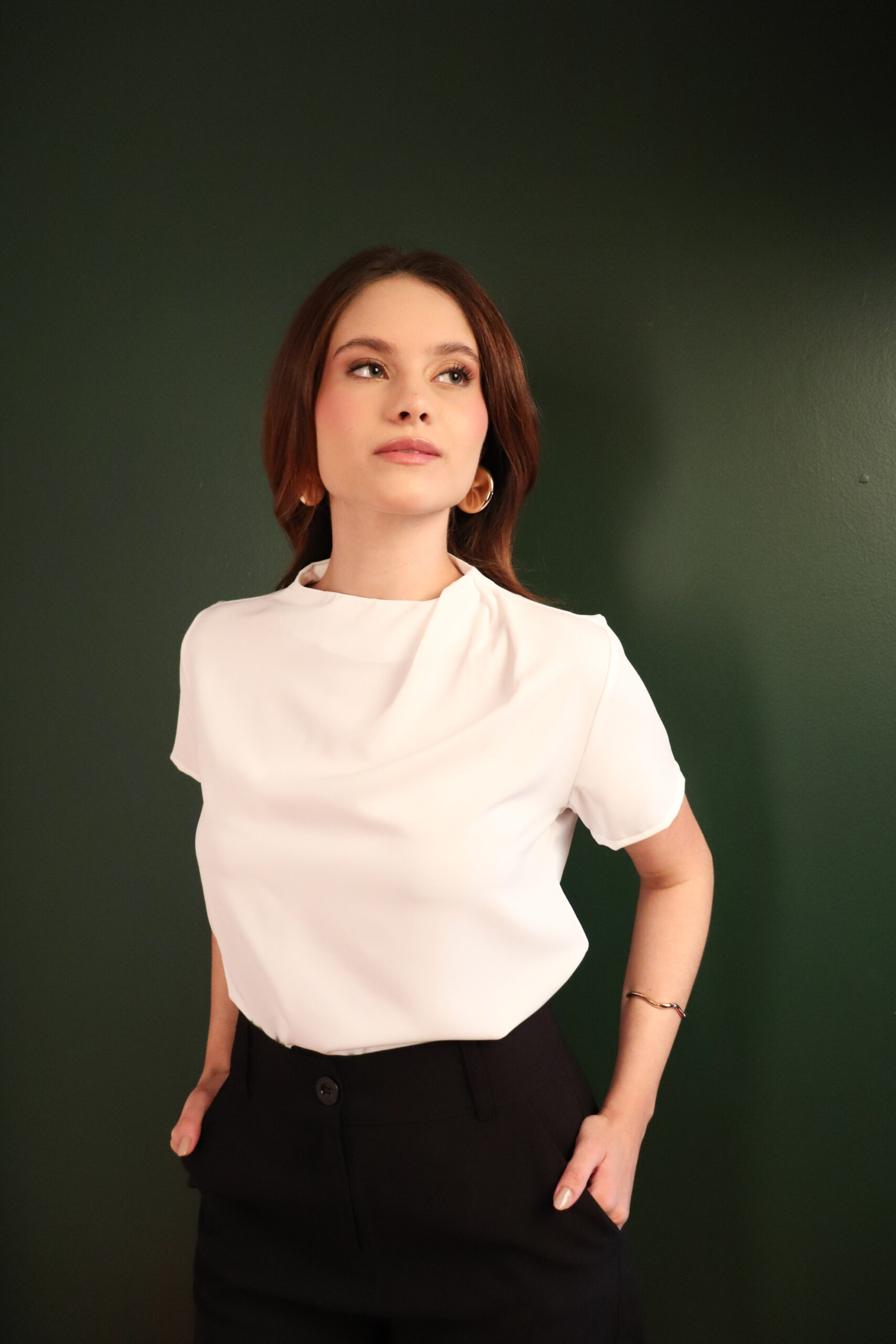 Blusa confeccionada em crepe, com caimento leve e toque suave, garantindo conforto e elegância ao vestir. Possui gola arredondada, com mangas. O destaque fica por conta da gola com delicado trabalho de pregas, que adiciona um charme sutil ao design. O fechamento nas costas é feito por abotoamento duplo, assegurando um acabamento refinado. Versátil e atemporal, essa blusa transita facilmente entre produções casuais e elegantes, compondo looks femininos com um toque de sofisticação.