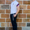 Possui 2 bolsos embutido na frente e um bolso quadrado nas costas.