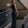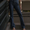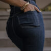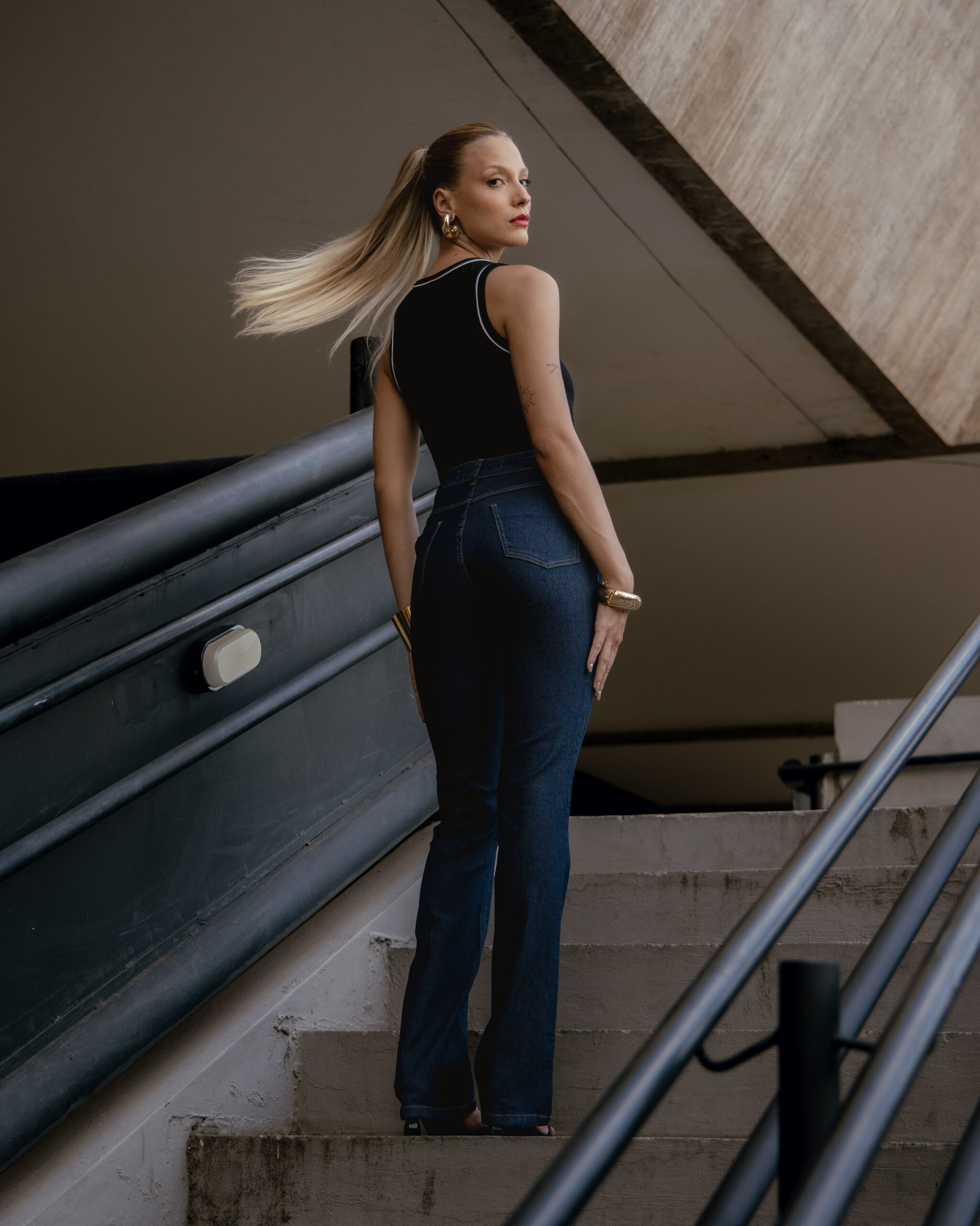A calça feminina reta, de cintura alta e lavagem escura, é uma peça versátil e atemporal. O corte reto proporciona um caimento sofisticado, alongando a silhueta, enquanto a cintura alta valoriza a estrutura do corpo e garante conforto. A tonalidade escura adiciona um toque elegante e facilita combinações para diferentes ocasiões.