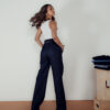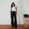 Calça confeccionada de um tecido denim de lavagem escura, com um corte pantalona que é super moderno e confortável. A cintura com elastico é um detalhe que adiciona estilo ao look, enquanto o bolso faca é um toque prático e estiloso.