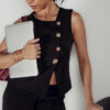 Colete confeccionado em tecido de alfaiataria de alta qualidade, com um design duplo assimétrico que é super moderno e sofisticado. Os 4 botões, cada um com um design diferente, adicionam um toque de personalidade e estilo à peça.