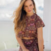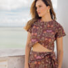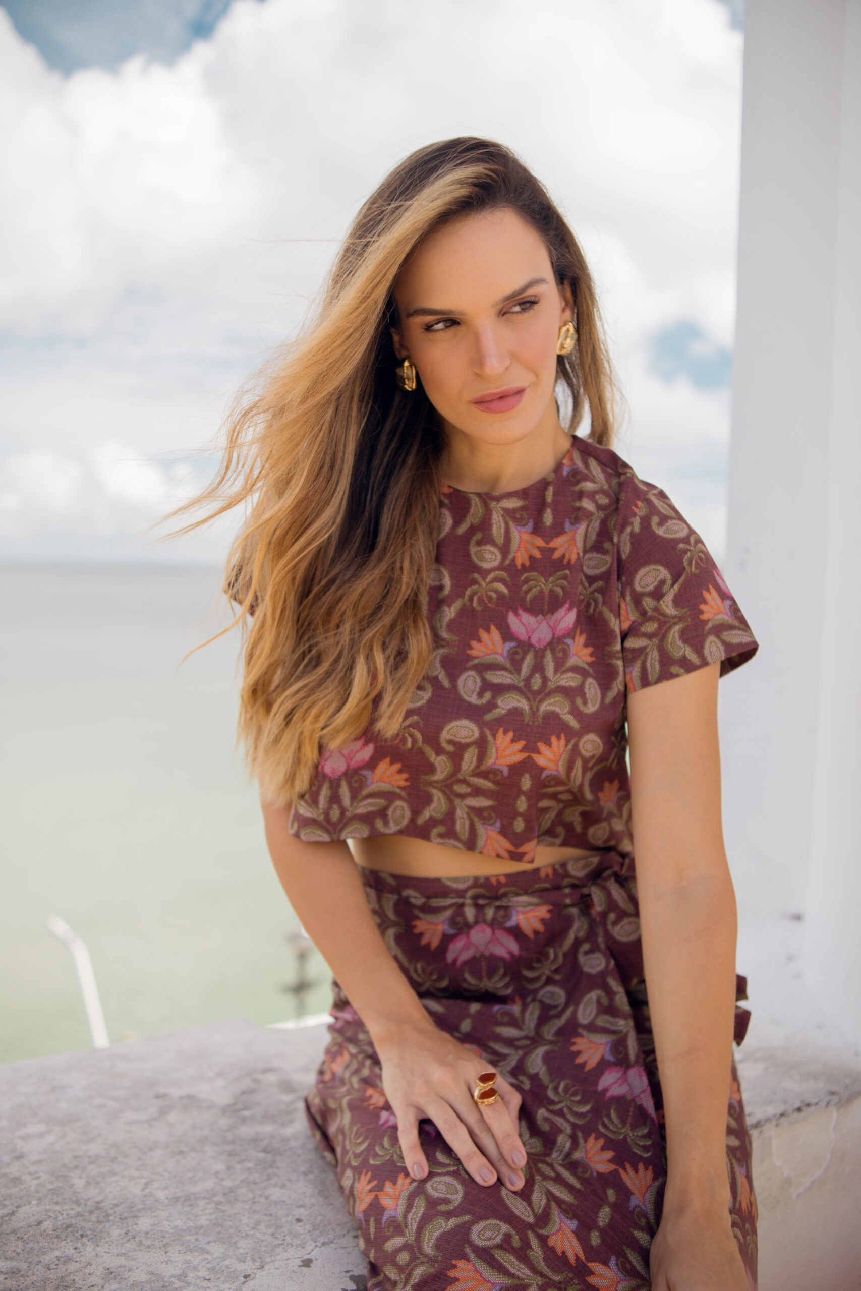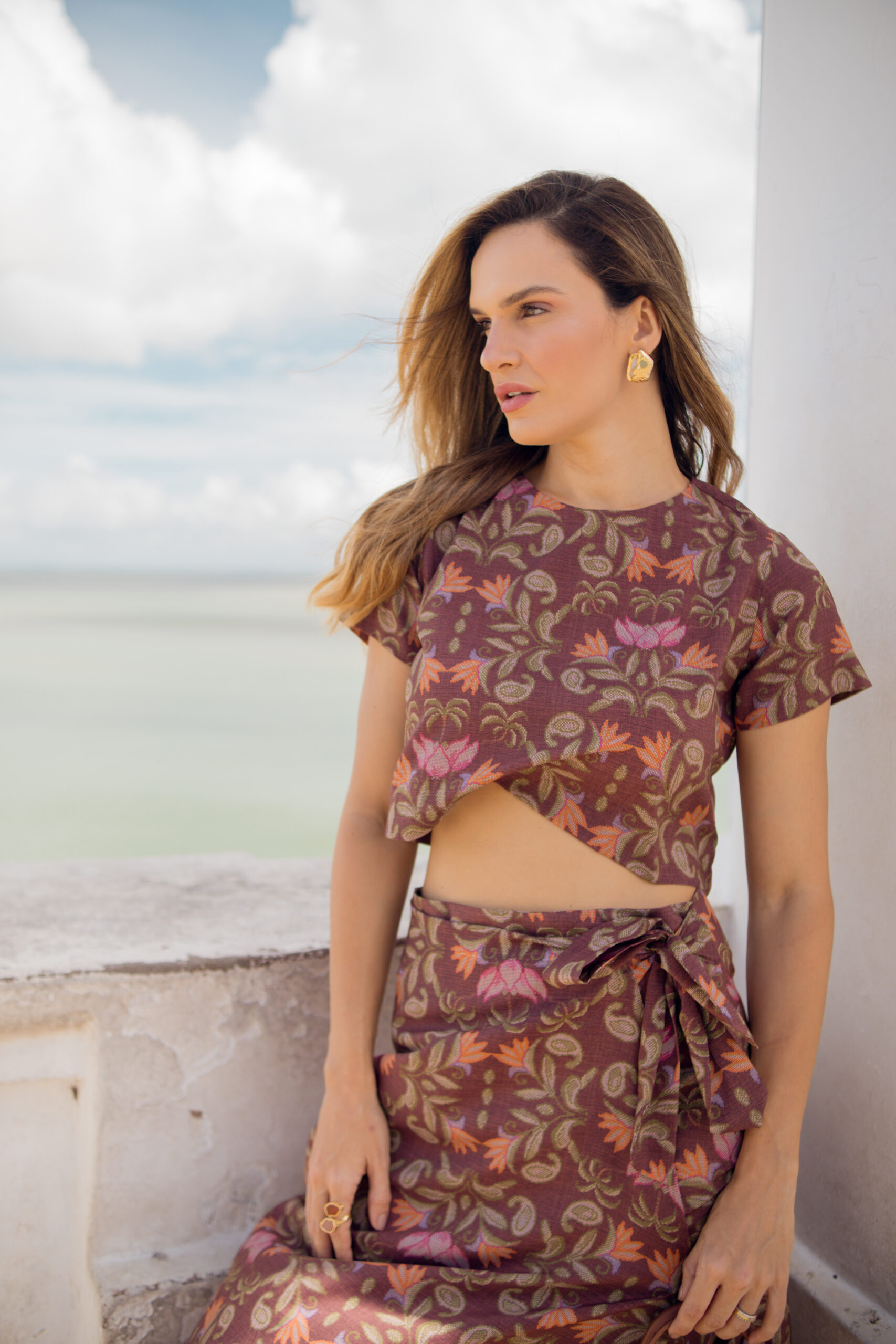 blusa cropped terra floral. Decote redondo e mangas tradicional que realçam o charme em cada detalhe. sua modelagem soltinha é perfeita para momentos casuais. os acabamentos como abotoamento nas costas é delicado e dão um toque especial, tornando-a essencial em qualquer guarda-roupa que valoriza conforto e estilo com autenticidade.