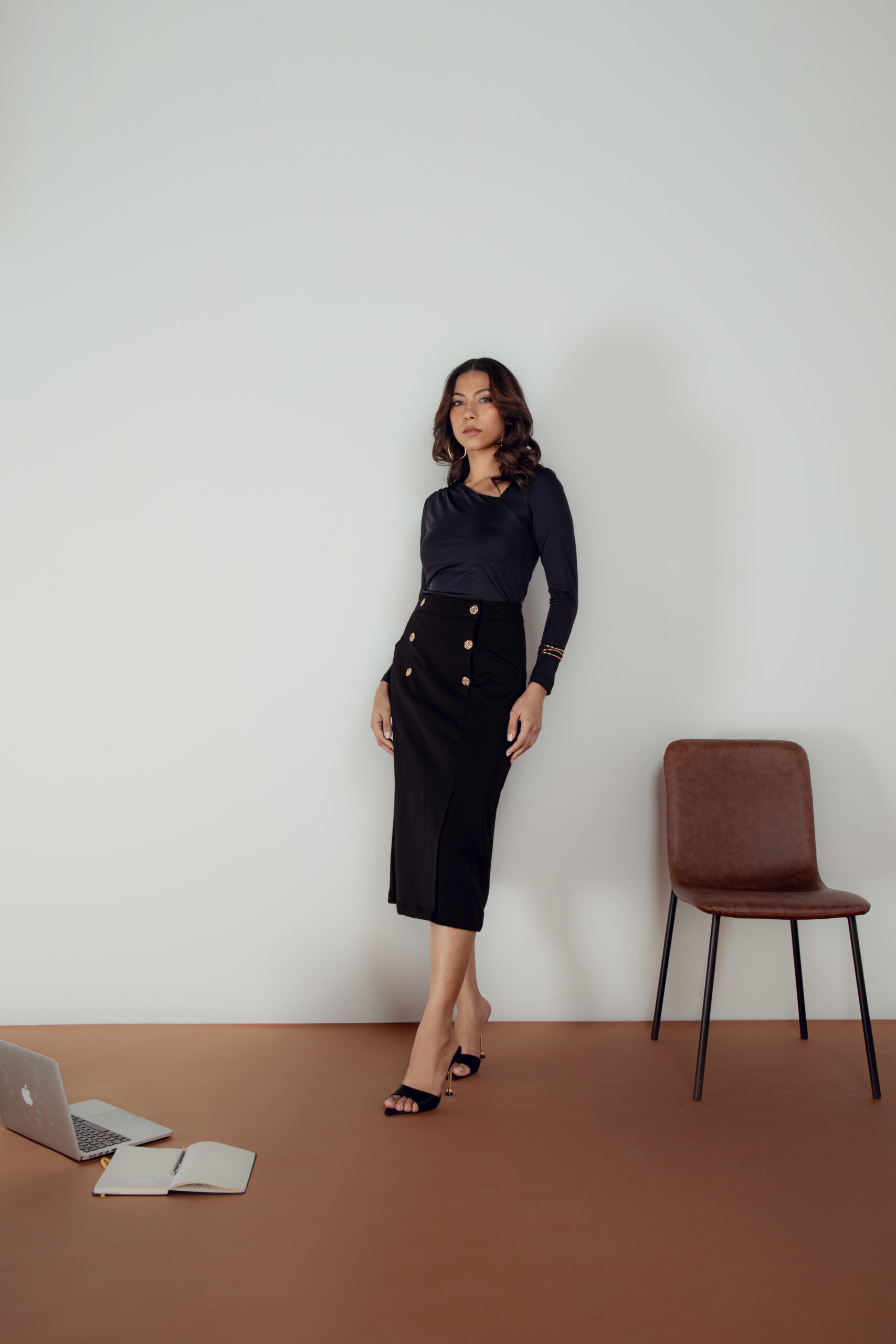 Saia confeccionado em tecido de alfaiataria de alta qualidade, com um design que é super moderno e sofisticado. Os 6 botões adicionam um toque de personalidade e estilo à peça.