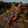 Nas costas, as alças em corda se cruzam formando um “X”. Podendo ser regulável, na altura que a cliente desejar.