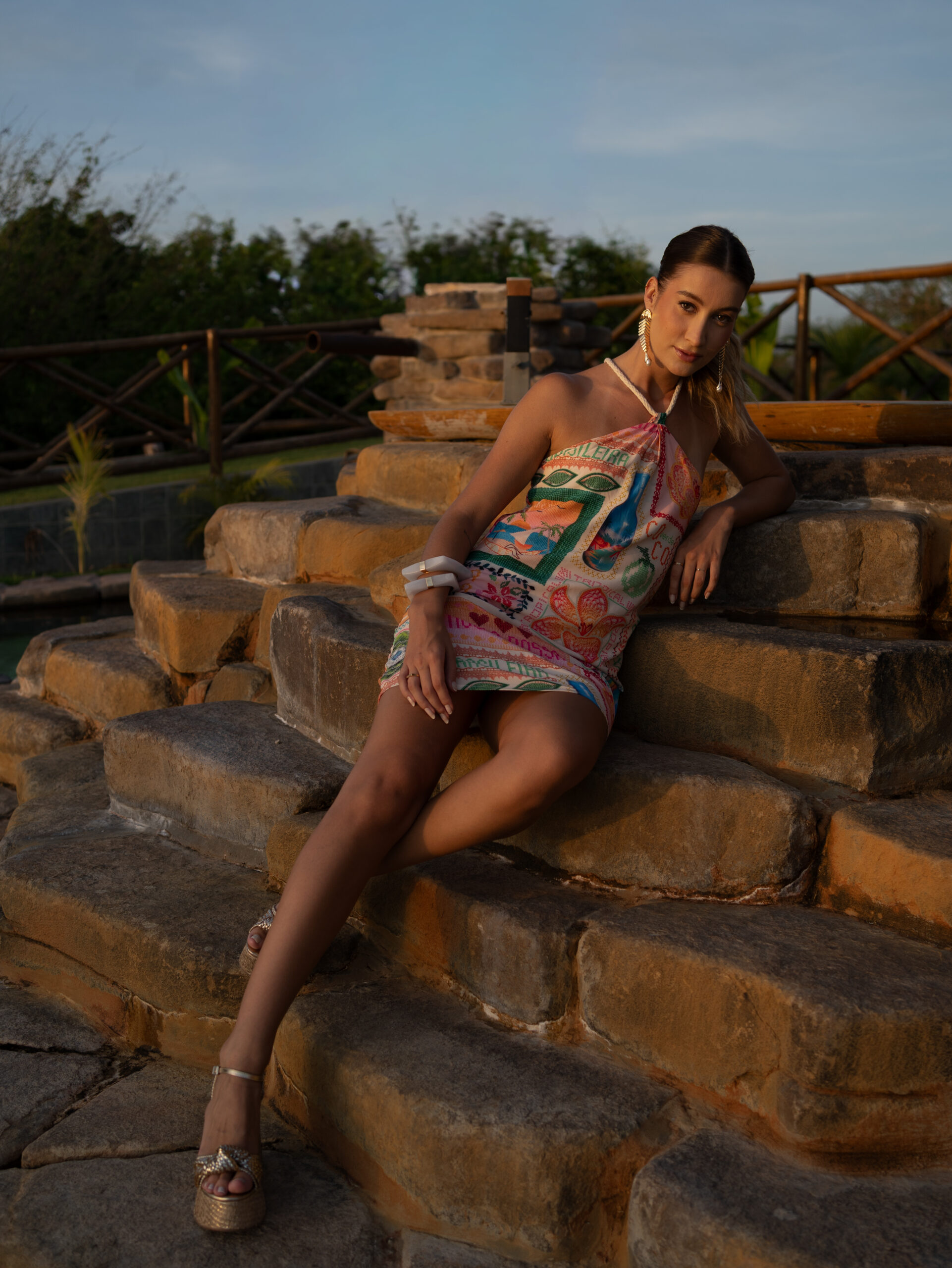 Vestido curto estampado. Com alças em corda natural, o decote halter une conforto e estilo em uma peça única. O corte soltinho traz leveza, ideal para momentos casuais ou um passeio ao ar livre. Confeccionado em tecido leve, é perfeito para dias de calor.